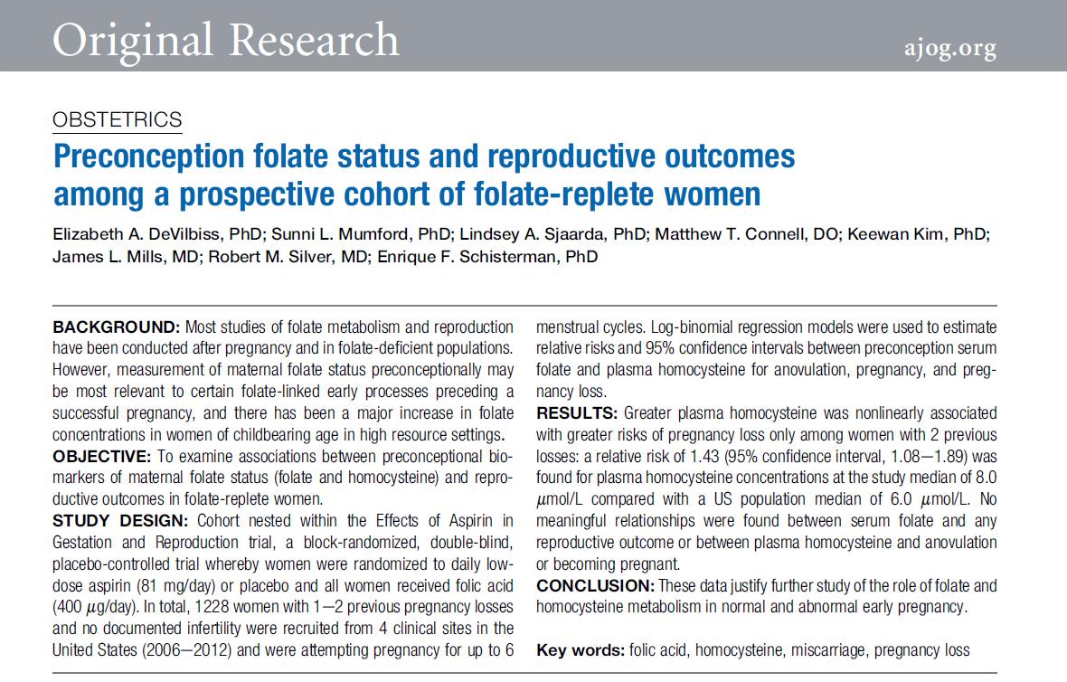 Истражувачите проспективно следеле 1.228 жени со историја на една или два претходни спонтани абортуси кои постојано се надополнувале со 400 μg фолна киселина киселина дневно. Наодите открија: