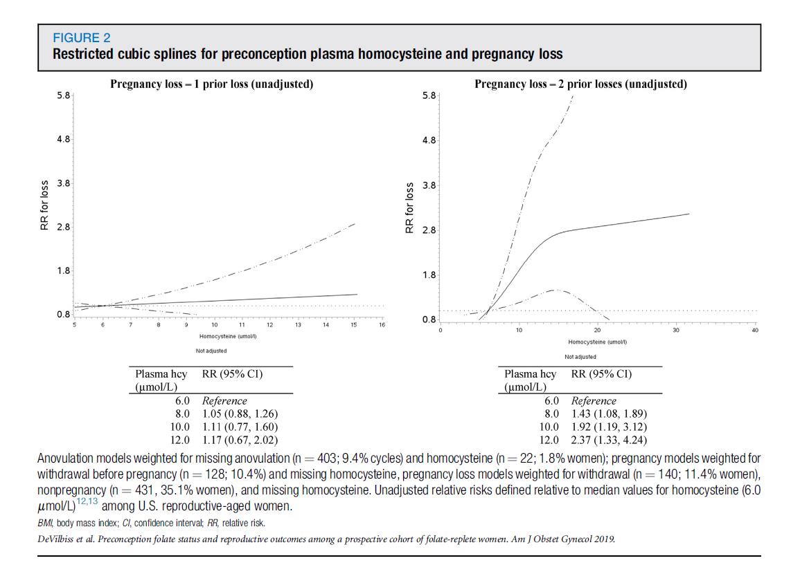 · Јасна врска зависна од дозатасо хомоцистеин (Hcy): кај жени со две претходни загуби, секоја од 2 µmol/L зголемувањето на Hcy (на пр., од 6µmol/L до 8µmol/L) беше поврзано со43% зголемување на ризикот од спонтан абортус.