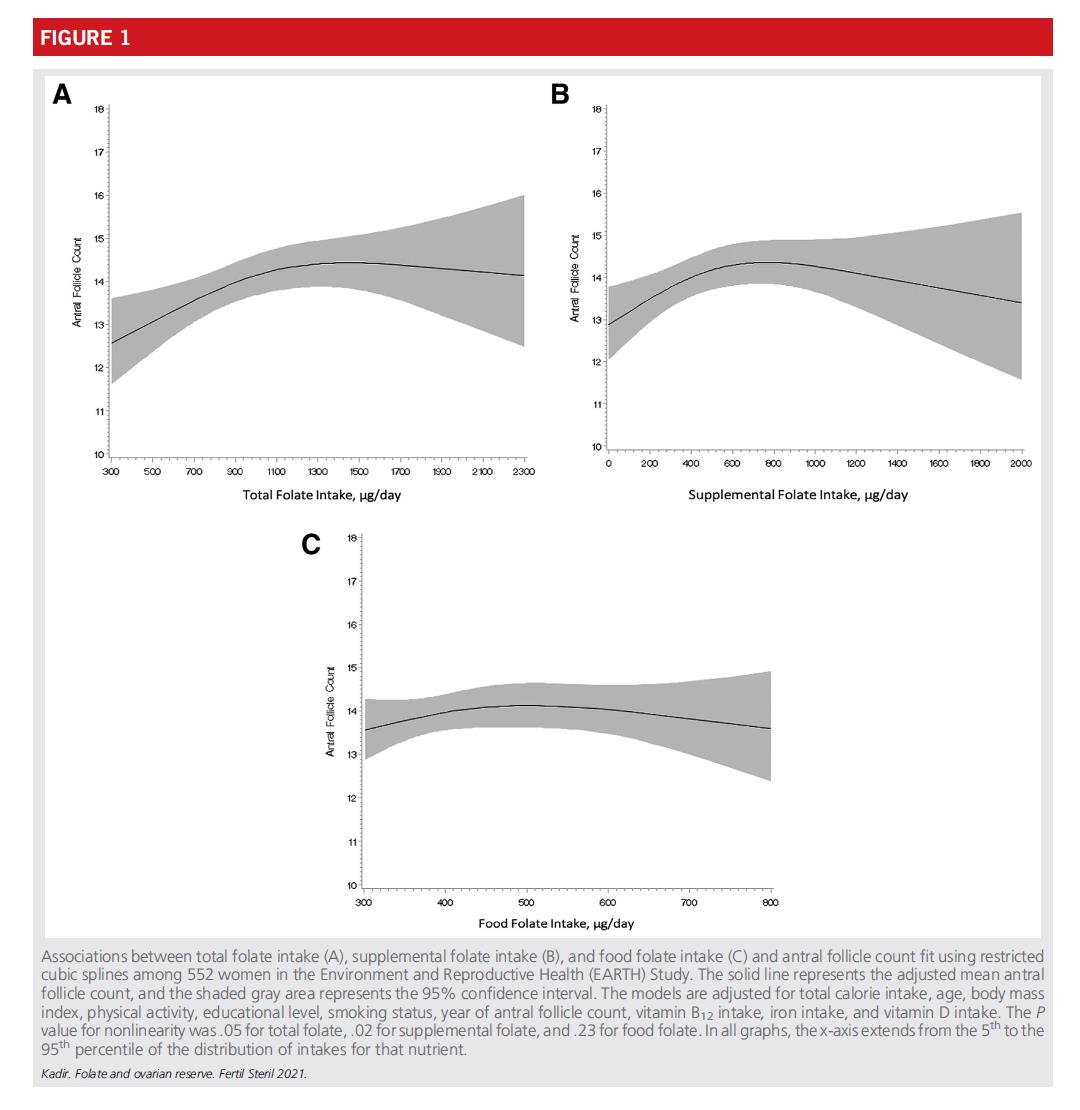 Податоците покажаа дека позитивната корелација помеѓу вкупниот внес на фолна киселина и AFC достигнува висорамнина на приближно1200 микрограми дневно. Највисоката придобивка за внесот на фолна киселина од суплементи (фолна киселина, синтетичка фолна киселина) се јавува на околу800 микрограми дневно. Во споредба со жените со дневен внес на 400 микрограми фолна киселина, оние кои консумираат 800 микрограми дневно се очекува да имаат пораст од приближно1,5 фоликули.
