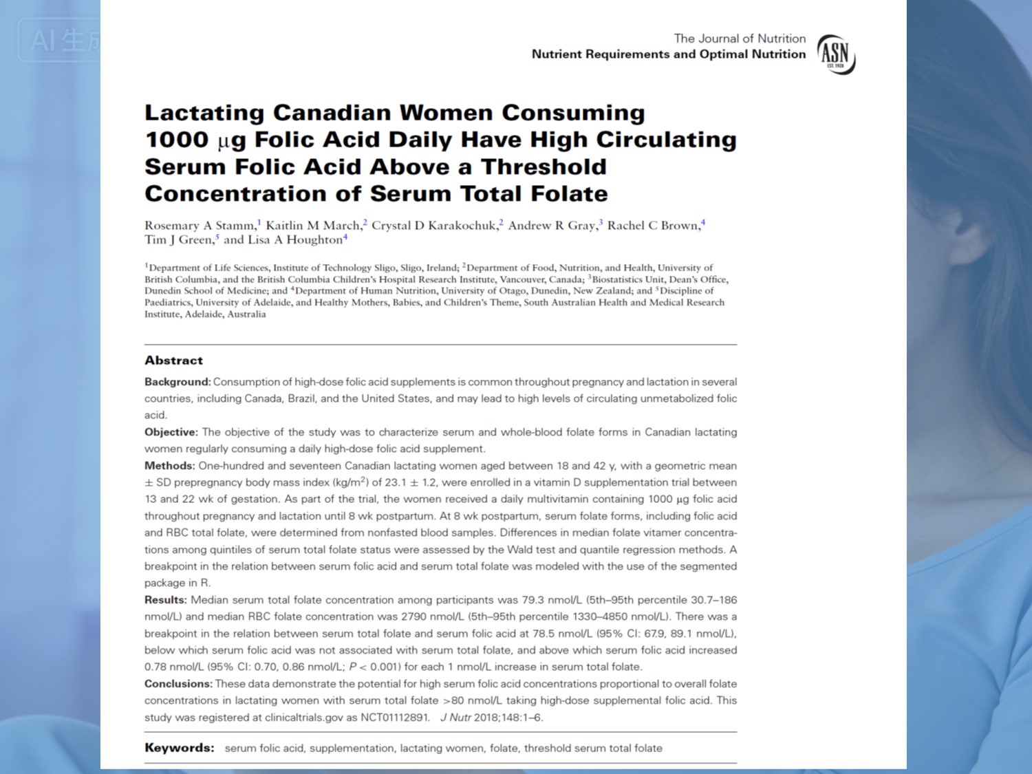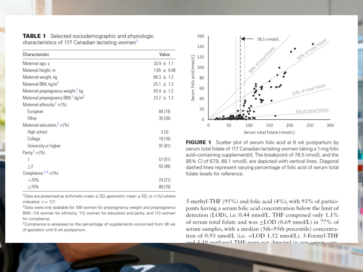 Во студијата биле вклучени 117 здрави доилки. Од средината на бременоста наваму земаа 1000 μg фолна киселина плус 12 μg витамин Б₁2дневно, продолжувајќи до 8 недели по породувањето. Примероци од крв собрани на 8 недели по породувањето беа анализирани за форми на фолати.