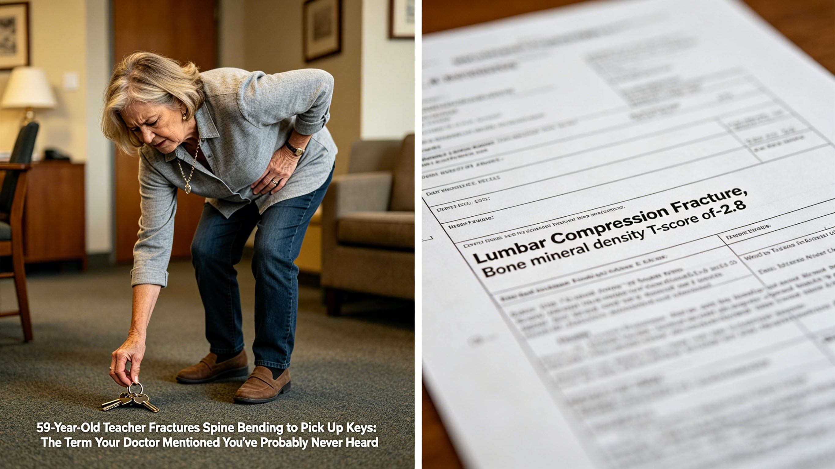 Еден студен зимски ден минатата година, таа се наведна да земе клуч. Додека стоеше, остра болка и се проби во долниот дел на грбот. На болничка рендгенска снимка е откриена фрактура на лумбална компресија, со Т-резултат со минерална густина на коските од -2,8.