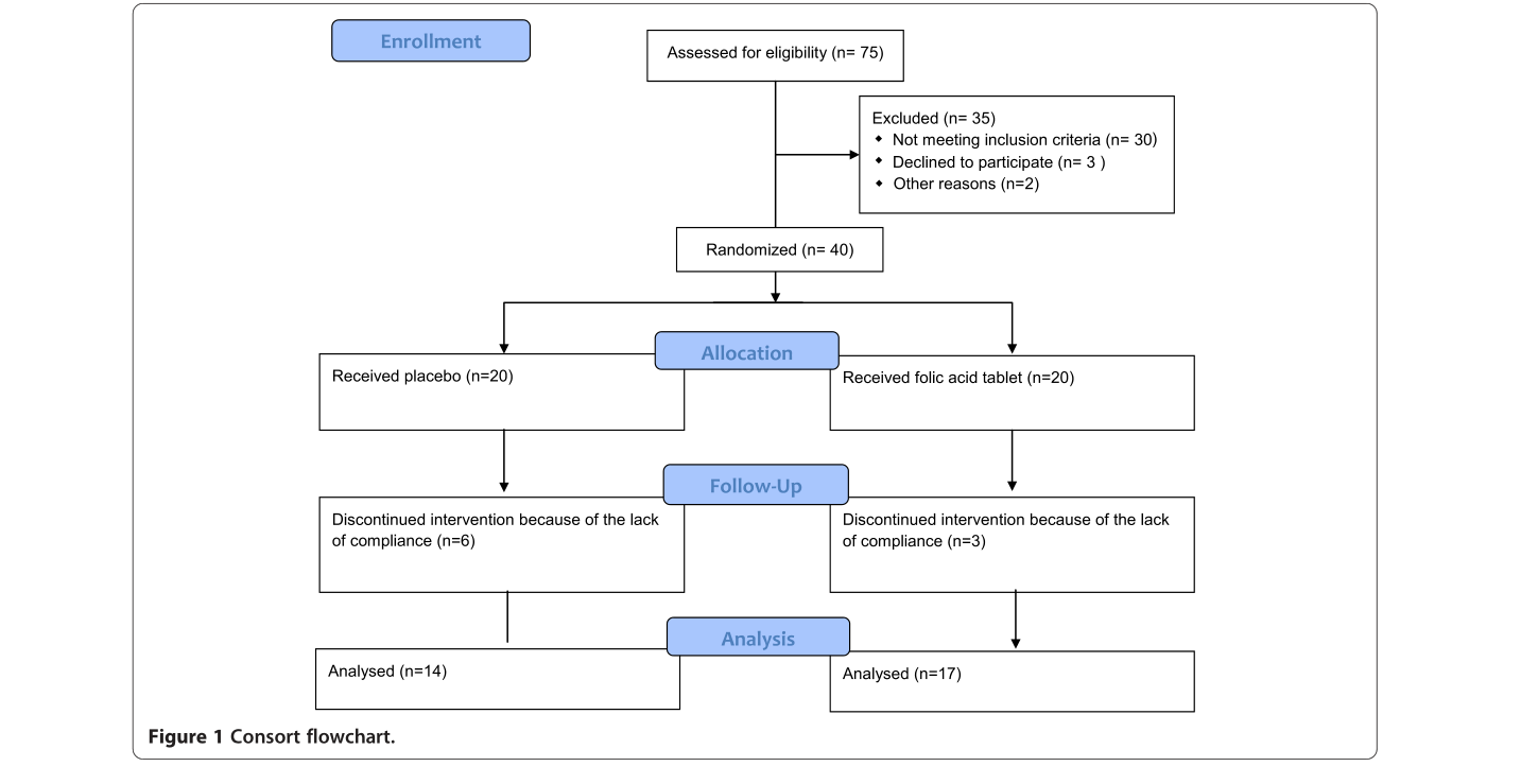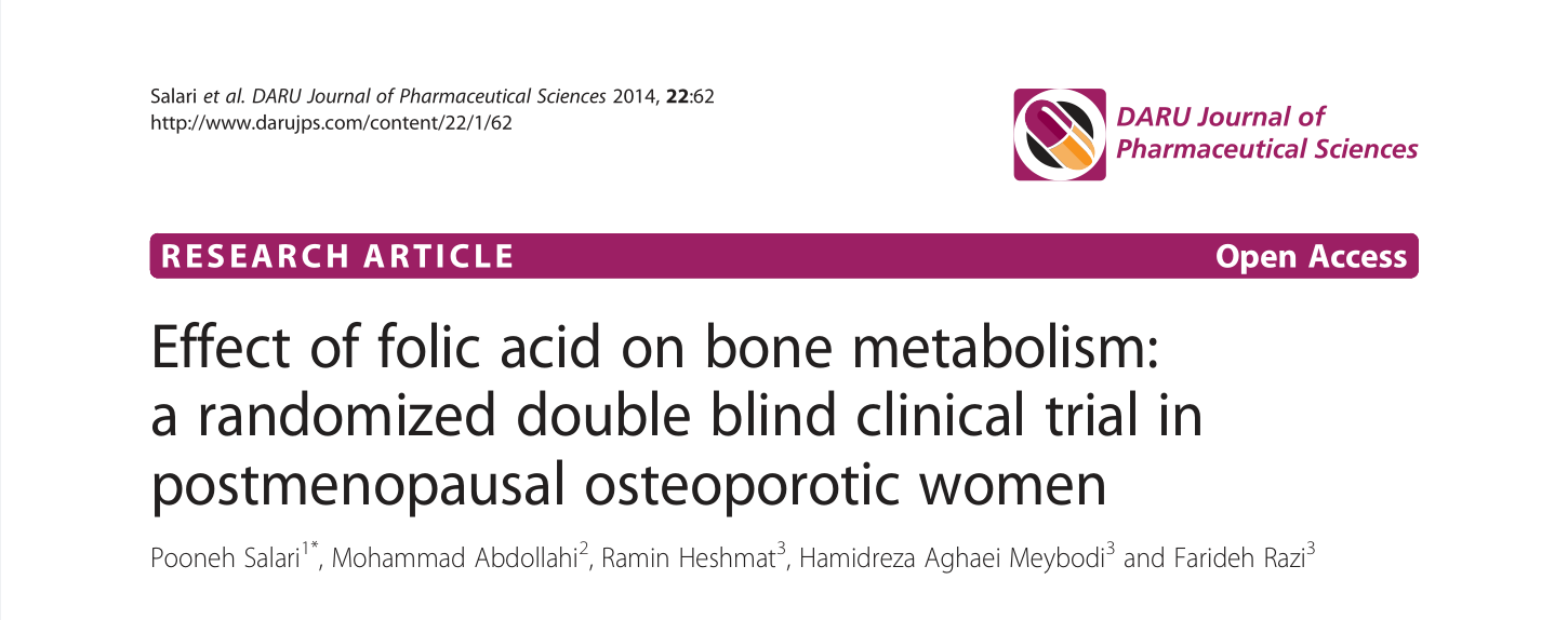 Во 2014 година, ирански истражувачки тим објави рандомизирано, двојно слепо испитување во *DARU Journal of Pharmaceutical Sciences* (IF 4.088 во тоа време) кое ги испитува ефектите на фолната киселина врз жените во постменопауза со остеопороза. Беа запишани 40 учесници: 17 во групата со фолна киселина и 14 во плацебо групата (некои се откажаа). Биле следени 6 месеци.